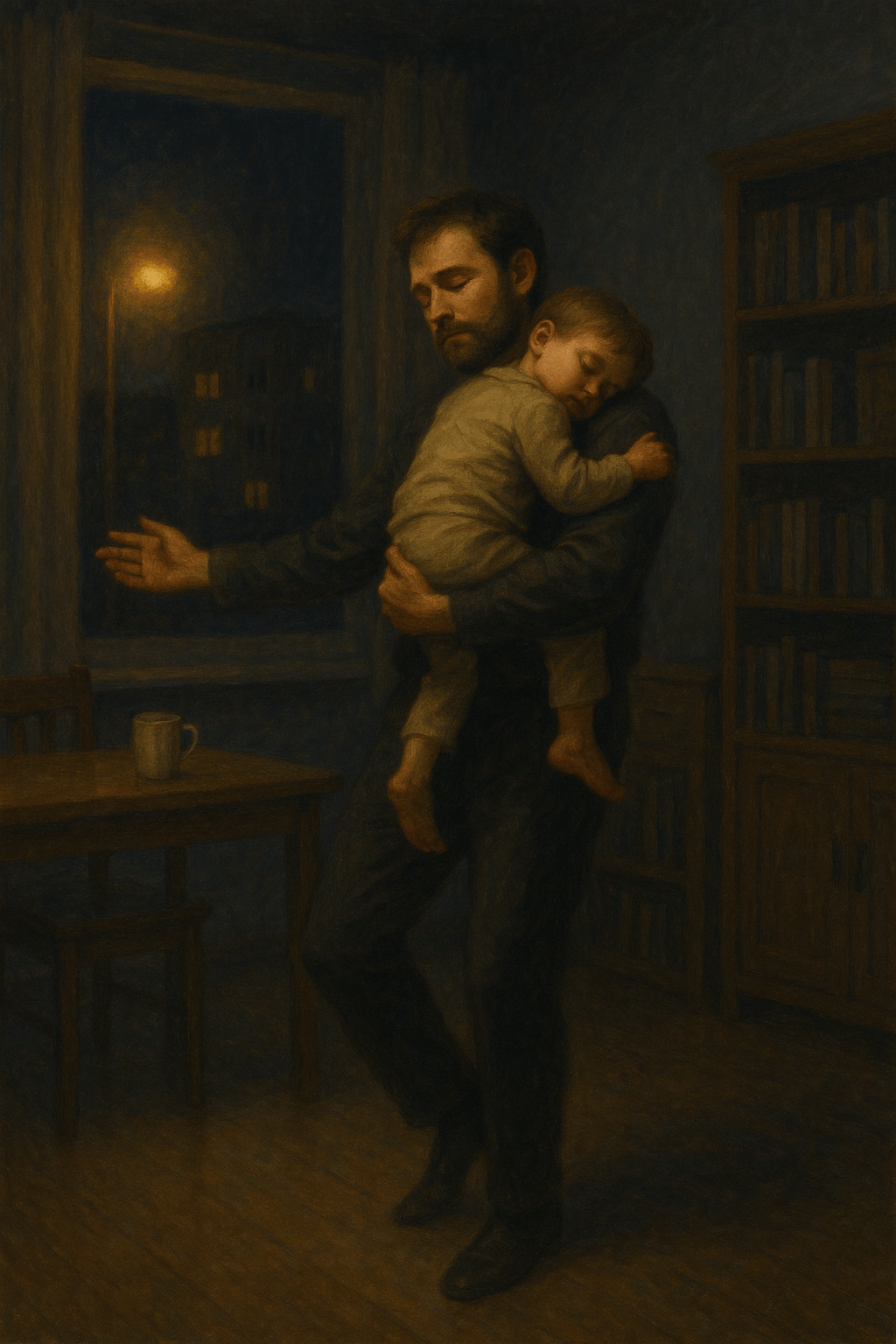 We draaiden rond in pirouettes, dansend in het donker, onze blikken verstrengeld. Na een tijdje legde hij zijn hoofd op mijn schouder en viel weer in slaap. Ik danste nog even door en liep vervolgens naar zijn bedje. Gaf hem een kus op zijn wang en kroop naast mijn vrouw.