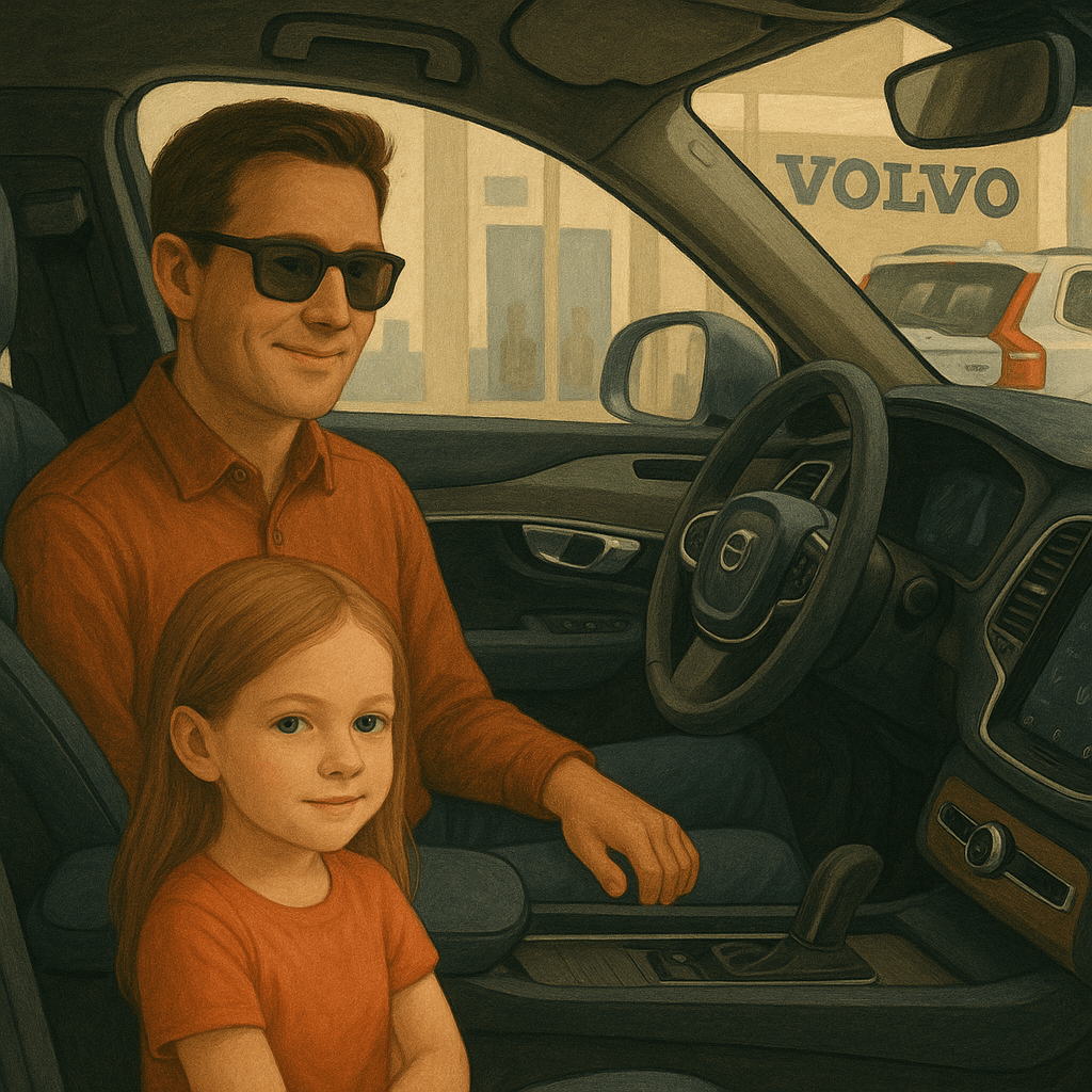 Hij kijkt me vol hoop aan en begeleidt mij en mijn dochter naar een luxe XC90. Degelijk. Robuust. Tikkeltje decadent, geef ik toe, maar hé, gezin met drie kinderen, deze vader moet wat. Bovendien kan ik deze auto helemaal niet betalen, het gaat me om het principe!
