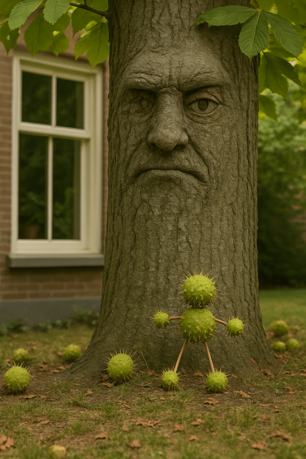 In de wetenschap heet mijn strenge-meneer-fenomeen antropomorfisme. Dat woord komt van het Griekse ἄνθρωπος (mens) en μορφή (vorm): menselijke vormen zien in dingen. Dat weet ik nu. Ik weet ook dat de boom een paardenkastanje was, die tijdens een prachtige bloei voornamelijk door insecten wordt bestoven. Ik weet nu ook dat mijn moeder en grootmoeder blij waren als we even buiten kastanjes raapten, zodat zij rustig konden bijpraten met koffie en een koekje.